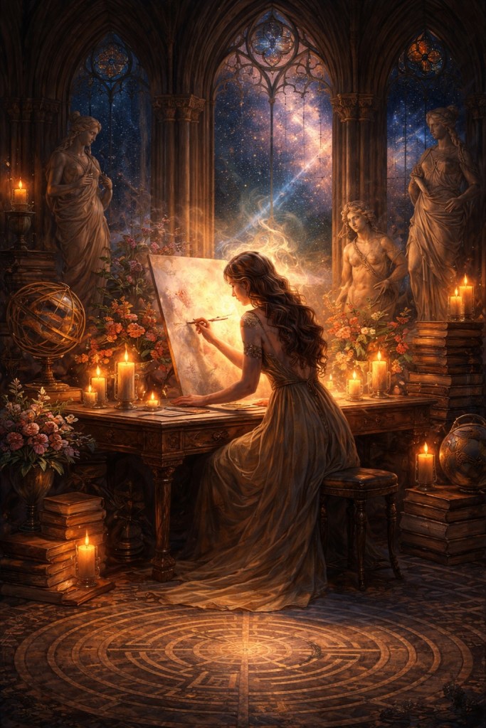 En la Casa de las Musas, Chartres vuelve. Pero no como camino, sino como símbolo. El laberinto ya no representa el trayecto lineal, sino el enigma. El centro extraviado. La búsqueda constante de equilibrio entre lo visible y lo invisible, entre lo masculino que protege y lo femenino que revela, entre lo racional que estructura y lo intuitivo que incendia.